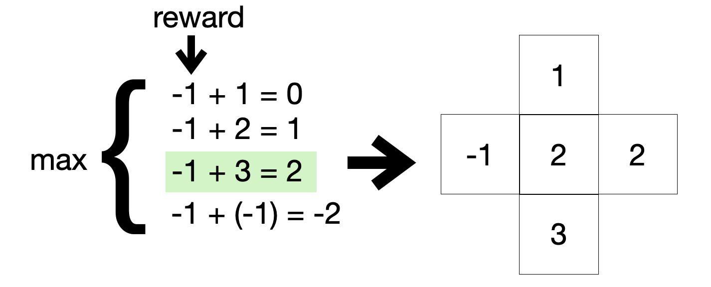 In this case the value of the current state (middle box) will be 2, which is calculated by taking the maximum value out of all 4 possible options after resolving the Bellman equation and adding the reward.