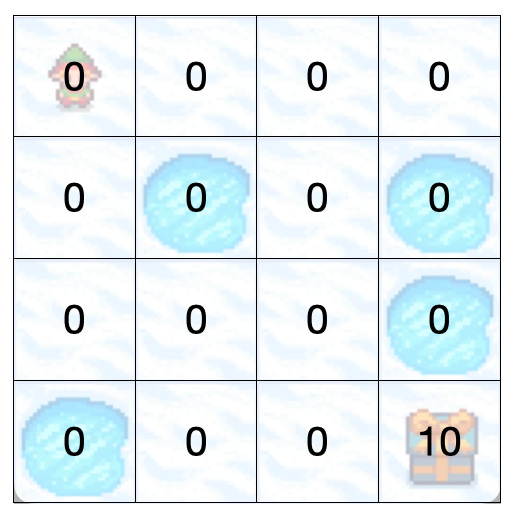 Frozen lake is a very cold world, so for each step Billy takes towards an empty cell he gets a negative reward of -1. This is because we want him to reach the goal in as few steps as possible before he freezes to death. When he reaches to the cell with the box of sweeties he gets a positive reward of 10.