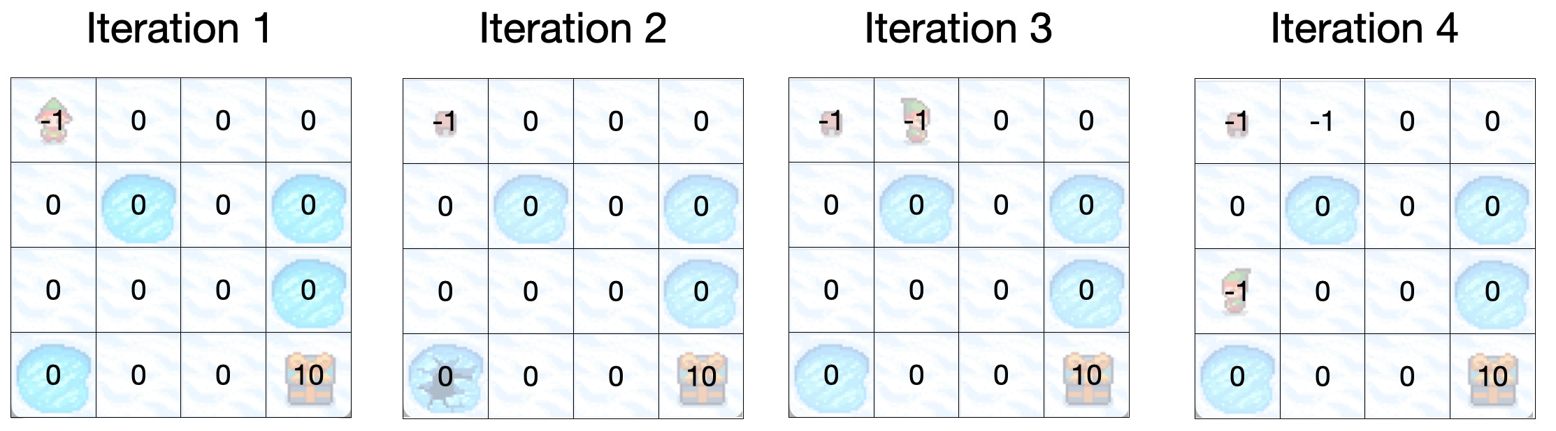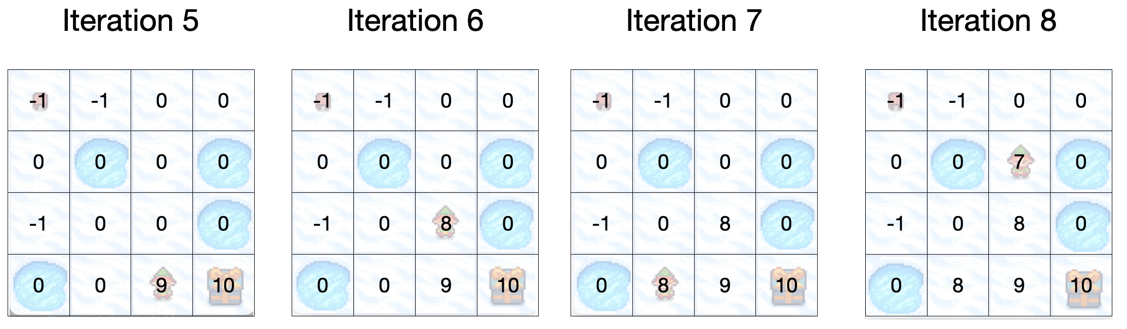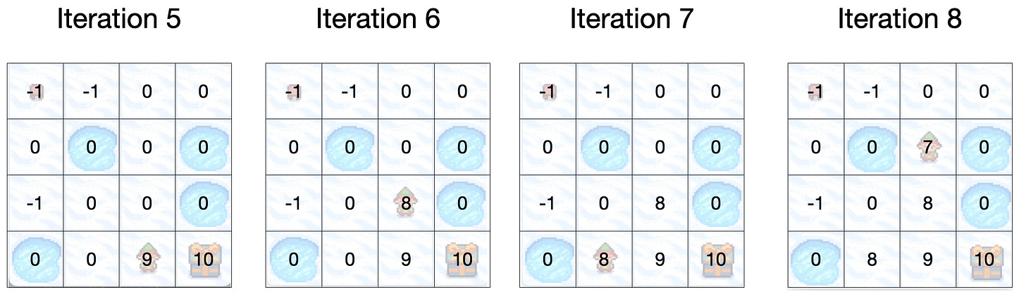 Notice how the value updates on iteration 5, and then it starts spreading across the other states in the following iterations.